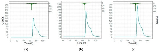 Synthetic hydrographs generated with the calibrated Iber model: (a) T = 15 years, (b) T = 20 years, (c) T = 25 years. The green bars represent the synthetic hyetograph.