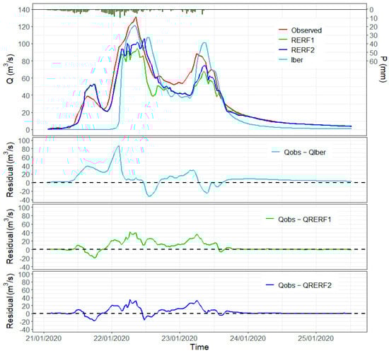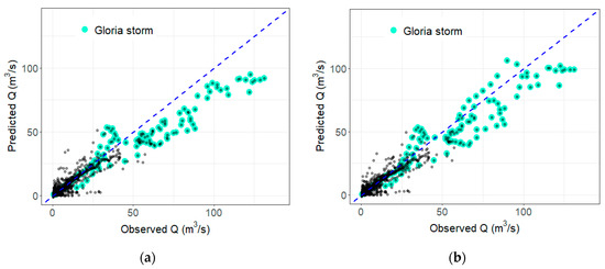 Figure 10 shows the scatter plot of both models, with an ideal tendency in blue. The highlighted points belong to the Gloria storm. All values higher than 60 (m3/s) belong to this storm. There are simple identified differences between the two plots, showing how several points are closer to the ideal line for RERF2, especially on high values. Apparently, this model has better performance. Nonetheless, this is not clearly depicted in the general error metrics (Table 1).
