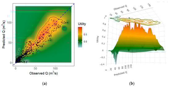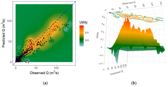 Graphical-based errors (GBE) are designed to give a meticulous image of certain aspects of the model performance. This study employs the utility surface for regression models [85], which is based on the interpolation of the individual utility values of every prediction. The inverse distance weighted (IDW) method is applied for utility interpolation. The IDW power of four was adopted to stress the influence of the nearest point [87] and to make the different utility values more distinguishable. The coordinates of the surface are the observed and predicted values. The GBE makes it simple to identify where the utility reaches the highest values or the cost generates negative values highlighting the model performance regarding the relevant data.