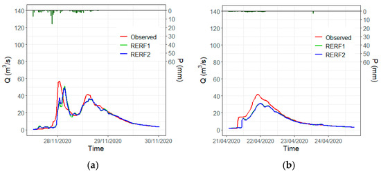 When we evaluate the models focusing on relevant ranges (, the difference in performance between models becomes apparent. The scalar errors are depicted in Table 2, where RERF2 model outperformed the RERF1 model in every metric. The precision measured by RMSE has increased, reaching the highest improvement at , where the most relevant streamflow values are located. Both models tend to underestimate high values. However, such a tendency is considerably reduced in RERF2, representing an improvement of up to 38.71%.