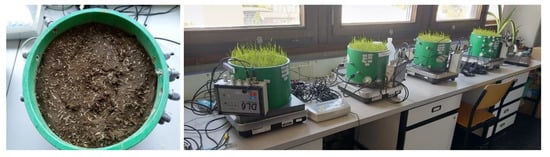 Experimental setup. (Left): Moist soil with the grass seeds. (Right): Four mini-lysimeters with DL6 data loggers mounted on scales after 18 days of initial growth.