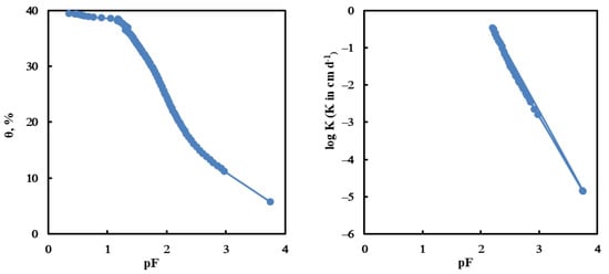 Retention curve and hydraulic conductivity curve of the material used in the small lysimeters. pF is defined by , where is the matric potential expressed as pressure head in cm.