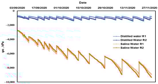 The changes in moisture, bulk electrical conductivity, and matric potential for each lysimeter were monitored. The evolution in osmotic potential in each lysimeter was calculated using Equations (2) and (3) considering the changes in soil moisture and bulk electrical conductivity. Daily and accumulated evapotranspiration were calculated based on the weighing balances data. The relationship between the evolution of osmotic potential and the daily evapotranspiration rate has been obtained. At the end of the experiment, when the soil became air-dry, samples were collected from three different depths (0–7, 7–14, and 14–20 cm) in each lysimeter to estimate the electrical conductivity and the spatial salt distribution.