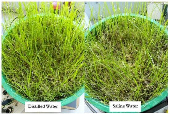 Since soil moisture was kept high enough to meet the ETo requirement, the relative reduction in the salt treatment is entirely due to the effect of salt on both evaporation and transpiration. The change in soluble salt content leads to a decrease in evaporation rate due to the reduction in water vapor pressure [36]. On the other hand, the transpiration rate decreased due to the effects on the gradient of soil water potential between soil and plant root, which controls the flow of water through the soil–plant system [15,16]. With ongoing time, this was superimposed by a deterioration in plant health, which was observed in the salt treatment from about 20 days after treatment, as shown in Figure 6.
