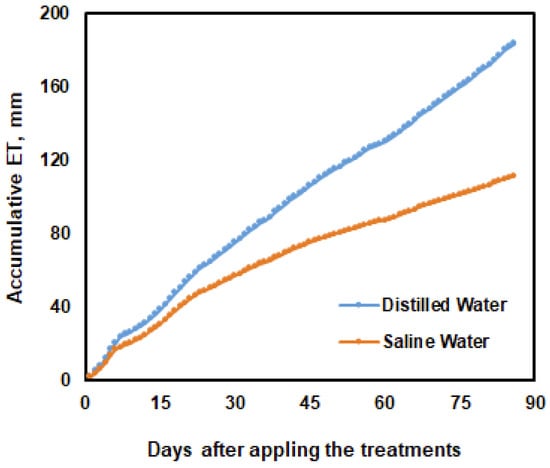 Figure 7 shows the effect of the experimental treatments on cumulative evapotranspiration. At the end of the experiment, accumulated evapotranspiration reached 112 mm in the saline treatment, while it was 184 mm in the treatments irrigated with distilled water. The reduction in cumulative evapotranspiration was 39% during the experimental period. It is noteworthy that irrigation with saline water resulted in a reduction in the number of irrigation events required, with a recorded frequency of 12 events, compared to the 17 events observed in the distilled water treatment (Table 2).