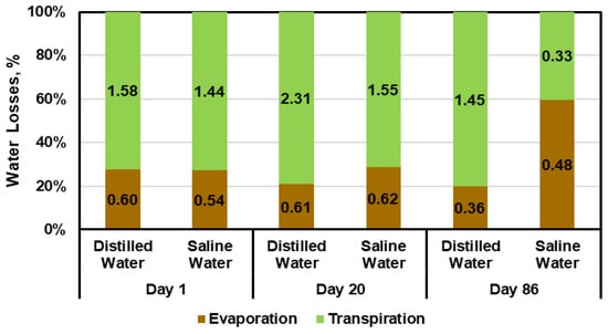 In the further course of the experiment, the increasing impact of saline solution on plant health is reflected in the reduction in GC and LAI, as presented in Table 3 for three key dates. The relative decrease in the transpiration component for the saline water treatment became stronger with time. On day 20, the values for E and T for the saline water treatment were 0.62 mm d−1 and 1.55 mm d−1, while they were 0.61 mm d−1 and 2.31 mm d−1 for the distilled water treatment. In the further course of the experiment, the evaporation rate for the saline water treatment was, interestingly, slightly higher than that of the distilled water treatment, which can be attributed to the decrease in GC, which, in turn, increased the available surface area of the soil for evaporation. On day 86, this effect was most pronounced due to the substantial reduction in GC and LAI (Table 3) for the saline solution treatment, which showed an evaporation value of 0.48 mm d−1 compared to the distilled water treatment with 0.36 mm d−1. In contrast, transpiration was lowered in the saline variant down to 0.33 mm d−1 compared to the distilled water treatment with 1.45 mm d−1.