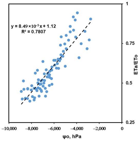The relationship between Ψo and ETa is presented in Figure 9. ETa in this figure refers to the daily evapotranspiration from the lysimeters that were irrigated with saline solution, while the ETo refers to the evapotranspiration from the lysimeters that were irrigated with distilled water. We assume that the evapotranspiration values for the distilled water treatment can serve as a reference for comparison. The data in Figure 9 show a strong and roughly linear relationship between ETa/ETo and Ψo. The decreasing Ψo in the root zone causes a significant reduction in the daily evapotranspiration. At the lowest values of Ψo, when it reached about −9000 hPa, the ETa/ETo ratio was about 0.4, i.e., the reduction in the daily evapotranspiration reached 60%.