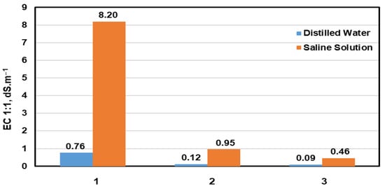 Figure 10 finally shows the electrical conductivity of the 1:1 soil:water extracts for the studied treatments, obtained in three depth layers after the end of the experiment. The results indicate a strong salt accumulation due to the irrigation with saline solution, but also a relative accumulation of native salt in the soil in the control. The electrical conductivity of the top layer reached 8.2 dS m−1 for the saline water treatment, while it was 0.76 dS m−1 for the distilled water treatment. These results indicate that primarily due to evaporation, most of the soluble salts moved to the upper layer. For the distilled water treatment, the electrical conductivity for the top layer was 0.76 dS m−1, while it was 0.12 and 0.09 dS m−1 for the middle and lower layers, respectively. In the case of the saline solution treatment, the electrical conductivity for the upper, middle, and lower layers was 8.20, 0.95, and 0.46 dS m−1 in succession. The illustration of the salinity distribution shows the importance of the soil water flow, whether the flow is within the soil profile or through the soil–atmosphere or soil–plant systems. This is particularly important in arid and semi-arid regions, salt-affected soils, coastal lands, and when low-quality water is used for irrigation. When the salts accumulate near the soil surface, they apply a driving force to the soil surface and affect the water flow. The accumulation of soluble salts on the soil surface results in an increase in hydraulic gradient by reducing the osmotic potential, thereby stimulating the movement of water from the soil body towards the surface. On the other hand, precipitation of salts on the soil surface reduces the flow of water from the soil to the atmosphere, due to the mulching effect of the precipitated salts on the soil surface.