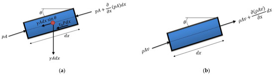 Freebody diagram applied to: (a) momentum equation; and (b) continuity equation.