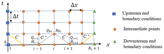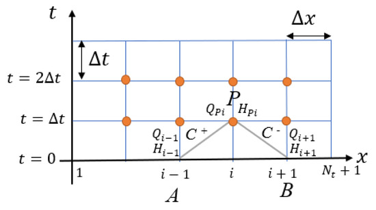 There is no numerical resolution for the differential formulations system composed by Equations (1) and (2), so the Method of Characteristics (MOC) is applied as a numerical technique resolution. To apply the MOC, a single pipeline with a total length (L) is divided in N segments, then: and . Figure 2 shows the used calculation grid for applying MOC. Utilizing the finite differences scheme, the characteristic lines and are determined with Equations (3) and (4):