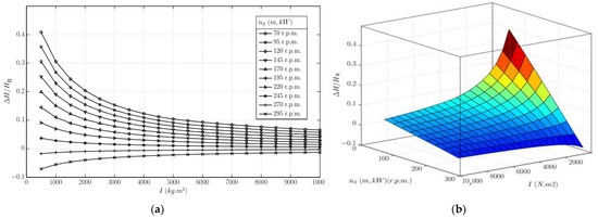 Relationship between maximum relative overpressure head, inertia of the runner, and specific speed: (a) plan view and (b) 3D view, better showing the curvature significance effect for both inertia and specific-speed variation.
