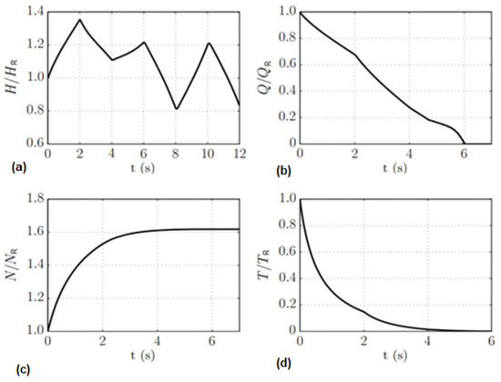 Full-load rejection for a hydropower case study: (a) Relative pressure head; (b) Relative discharge; (c) Relative rotational speed and (d) Relative torque.