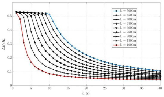 The same turbomachine used in the case study shown in Figure 7 was then used to investigate the influence of the length L on the penstock and its interaction with the closing time of the guide vanes (Figure 8). Sensitivity analysis was developed in this section, and it relates to the full-load rejection scenario with the consequent closure of the turbine guide vane. Figure 8 shows the maximum relative upsurge for different pipe lengths (), between 1000 and 4000 m, to show how small hydropower solutions usually with long penstocks can be quite dangerous due to the water column influence in the water hammer event.