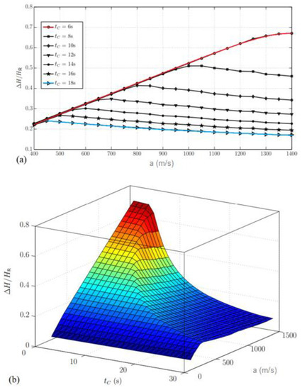 Maximum relative upsurges for a typical hydropower with different characteristics: (a) 2D representation for wave speed, , and guidevane closure time, , variation; and (b) 3D dependency on different combinations of these parameters.