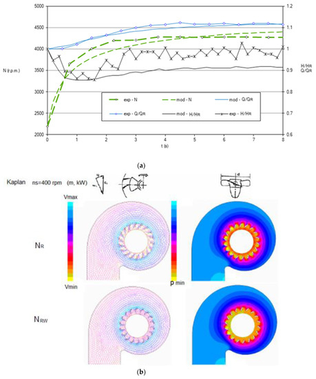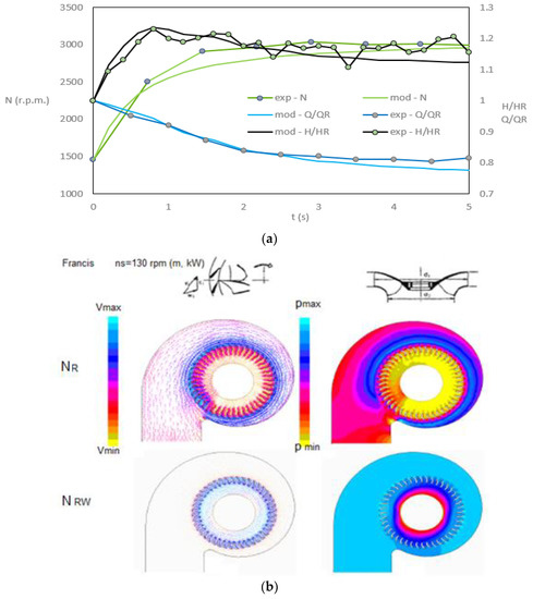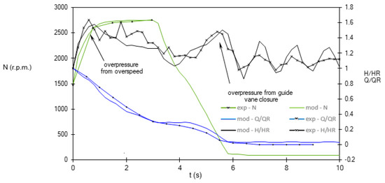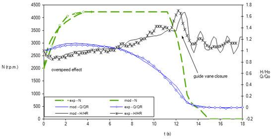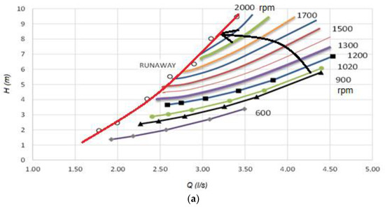 The initial condition for the simulation is the steady state in which the turbomachine operates at constant head and flow. At the time t = 0 s, the full-load rejection occurs and the guide vane is automatically actuated. Since the turbine has a low ns value, the runaway causes a considerable reduction in flow with a high upsurge, even greater than that caused by the closing of the guide vane, resulting in the first peak in head, visible in Figure 7a at about t = 2 s. At this point, the discharge reduction is no longer as strongly influenced by the overspeed effect and begins to be controlled mainly by the flow control (Figure 7b).