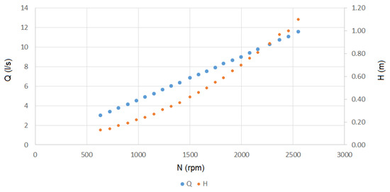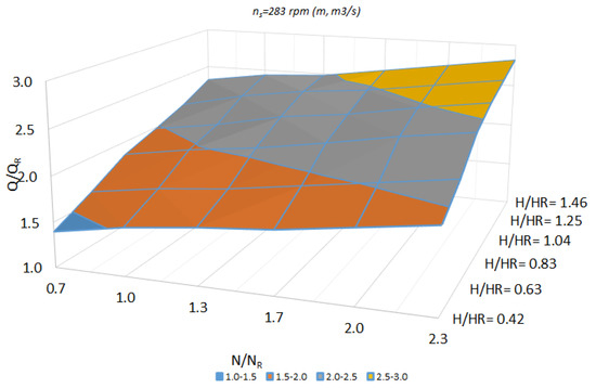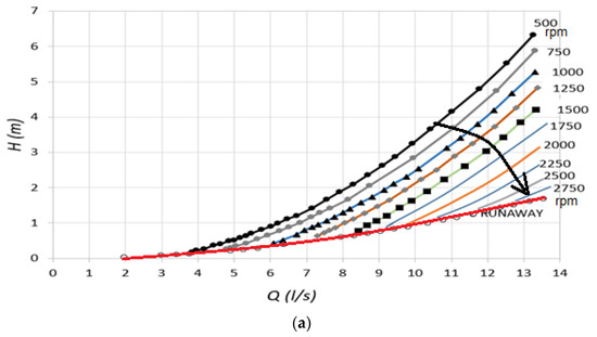 The affinity laws for turbomachines are expressed by Equation (28), which represents the mathematical relationship between the rotational speed (), flow rate (), head () and pump power (). The specific speed is then given by Equation (29).