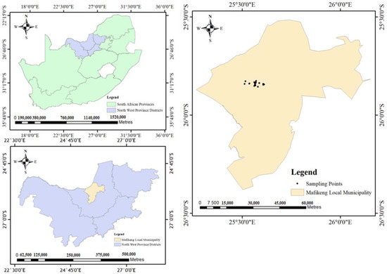 The research was conducted using samples from four selected villages in North West Province, South Africa (Figure 1). Generally, the geology of the area comprises nine lithological stratigraphic classes—namely, Swazian, Kalahari, Dwyka, Malmari, Allanridge, Kraaipan, Kameeldooms, Blackreef and Klipriviersberg. The Swazian category, which consists of granite and gneiss, is the dominant geological structure in the study area. These are very important in increasing the occurrence of groundwater due to the fractures present. The Malmari is made up of limestone, subordinate chert, minor carbonaceous shale, quartzite and dolomite. The chert-rich formations are significant in the formation of groundwater’s main aquifers. In the Blackreef, some fractures experience low permeability. The Kalahari is the most dominant geological landscape, with superficial deposits consisting of gravels, clays, sandstone, silcrete, calcrete and aeolian sand. Groundwater occurs mostly in crystalline rocks that are weathered near the surface and are later siphoned to fractured zones in deeper portions.