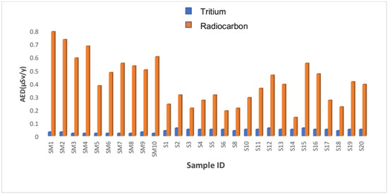 where As is the activity concentration of 3H/14C (Bq/L), Rs is the sample count rate (cps), Rb is the background count rate (cps), ε is the calculated efficiency, and Vs is the sample volume (20 mL). The obtained activity concentrations were used to estimate the annual effective dose (AED) using the following equation [17]: