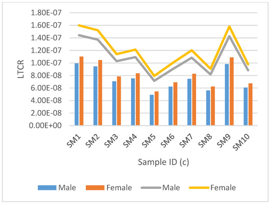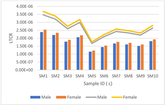 Samples from Moletsamongwe, Lekung, Airport View and Seweding are shown in Figure 4 and Figure 5. The mortality rate for males ranged from 4.4925 × 10−8 to 9.9136 × 10−8, with a mean average of 1.7416 × 10−8, and the mortality rate for females varied from 5.4624 × 10−8 to 1.1021 × 10−7, with an average of 8.2259 × 10−8. The morbidity rate for men ranged from 7.1460 × 10−8 to 1.4419 × 10−7, with a mean average of 1.0763 × 10−7, while the morbidity rate for women ranged from 7.9270 × 10−8 to 1.5994 × 10−7, with a mean average of 1.193 × 10−7. SM15 had the lowest LTCR in both mortality and morbidity for males and females, but SM1 had the highest LTCR. Figure 7 shows the results from the data collected from Moletsamongwe, Lekung, Aiport View and Seweding. The average male mortality rate was found to be 1.76067 × 10−6 and 2.5588 × 10−6 for morbidity, while the average female mortality rate was found to be 1.8682 × 10−6 and 2.7150 × 10−6 for morbidity. SM5 had the lowest LTCR in both mortality and morbidity for males and females, but SM1 had the highest LTCR.