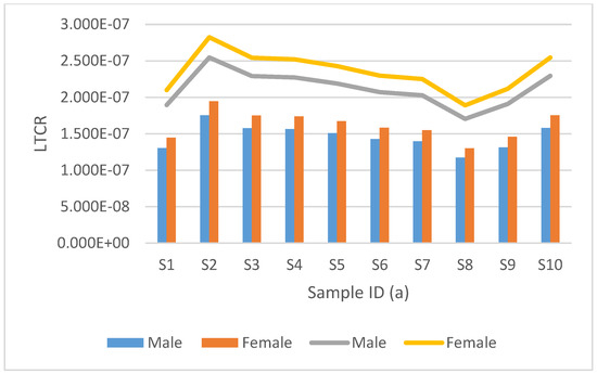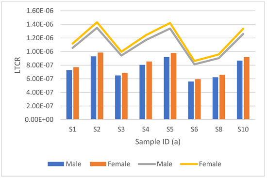 Figure 6 and Figure 7, show the LTCR results for radiocarbon, for data collected from Dibate village. The mortality rate for males varied from 1.1743 × 10−7 to 1.7543 × 10−7, with a mean average of 1.4610 × 10−7, and the mortality rate for females varied from 1.3026 × 10−7 to 1.9460 × 10−7 with an average of 1.6206 × 10−7. The morbidity rate for males ranged from 1.7095 × 10−7 to 2.5461 × 10−7, with a mean average of 2.1204 × 10−7, while the morbidity rate for females ranged from 1.8904 × 10−7 to 2.8241 × 10−7 with a mean average of 2.3519 × 10−7. It can be observed that S8 had the lowest LTCR in both mortality and morbidity for males and females, but S2 had the highest LTCR. The slight difference in the LTCR results from different activity concentrations and different sampling locations; some locations have a high tritium activity concentration, but some have a low concentration.