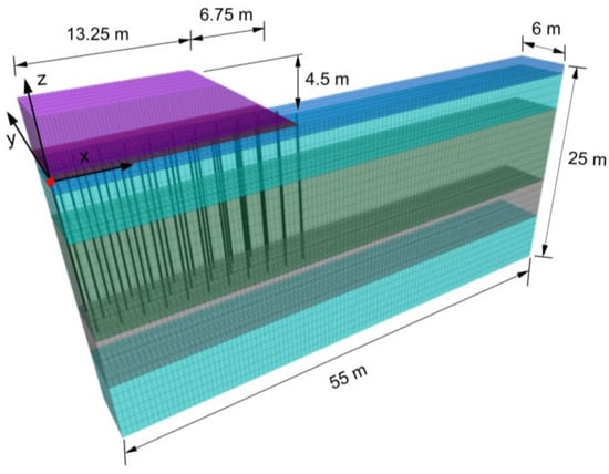 Taking into consideration the symmetry of the highway subgrade investigated in this study, half of the actual subgrade is numerically modeled. As depicted in Figure 2, in an attempt to eliminate the boundary effect, the overall length of the numerical model in x direction is taken as 55 m, and the overall width in y direction is taken as 6 m. In z direction, the height of the meshing for the ground below the subgrade is 25 m. The subgrade is of 13.25 m in top surface width and 4.5 m in height. On the right side of the subgrade, the slope ratio of the subgrade is 1:1.5. A cushion lies between the subgrade and the ground with a thickness of 0.5 m. The numerical model is divided into 110 meshes in the x-direction, six meshes in the y-direction, and 25 meshes in the z-direction. During the construction, the subgrade is filled in four layers. The deep mixed piles are 14 m in length, 0.6 m in diameter. The piles completely penetrate the soft soil layers, with their bottoms being in the hard clay layer. The arrangement of the deep mixed piles is triangular, with a distance of 2 m between two adjacent piles. In the finite difference analysis, the structural pile elements are used to simulate the deep mixed piles. Elasticity modulus and the unit weight of the deep mixed piles are, respectively, 400 MPa and 25 kN/m3. In FLAC numerical calculation software, the maximum unbalanced force in all nodes can measure the convergence of mesh. If the mesh of the model has zero force in the calculation, this means that the numerical calculation has reached equilibrium. In other words, the closer the maximum unbalance force is to zero, the better the convergence of the model. In this model, the maximum unbalanced force ratio value is set up to 1 × 10−5, and the computational convergence meets this criterion.