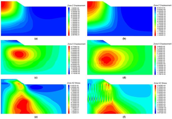 Contours of: (a) Z displacement for natural foundation (m); (b) Z displacement for composite foundation (m); (c) X displacement for natural foundation (m); (d) X displacement for composite foundation (m); (e) XZ stress for natural foundation (Pa); (f) XZ stress for composite foundation (Pa).
