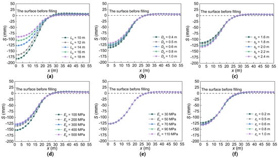 Variations of composite foundation settlements (i.e., S) with parameters related to piles and cushion: (a) Lp; (b) Dp; (c) sp; (d) Ep; (e) Ec; (f) zc.