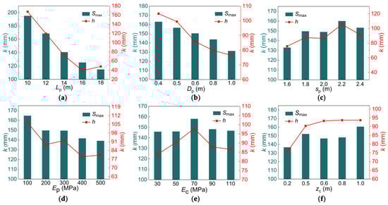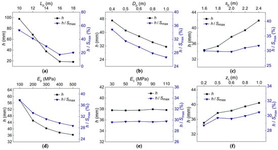 Variations of the maximum composite foundation settlement (i.e., Smax) and the maximum compression of soft soil layer (i.e., h) with parameters related to columns and cushion: (a) Lp; (b) Dp; (c) sp; (d) Ep; (e) Ec; (f) zc.