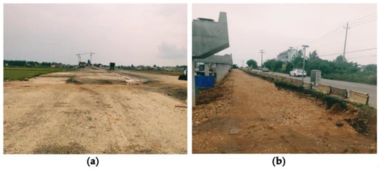 Photos of the project site: (a) ground improvement; (b) highway widening.