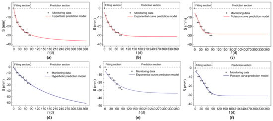 Fitting of the monitored settlements at two monitoring sections (MS) by using three different models: (a) hyperbolic prediction model for MS 1; (b)exponential curve prediction model for MS 1; (c) Poisson curve prediction model for MS 1; (d) hyperbolic prediction model for MS 2; (e) exponential curve prediction model for MS 2; (f) Poisson curve prediction model for MS 2.