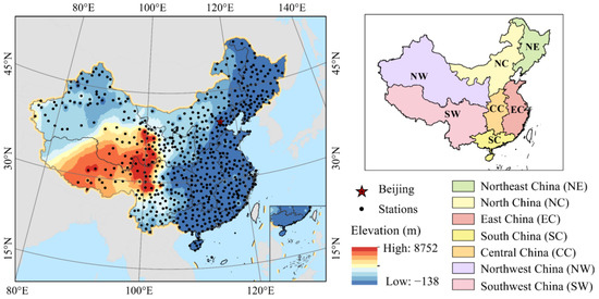 Distribution of elevation, meteorological stations, and seven regions in China.
