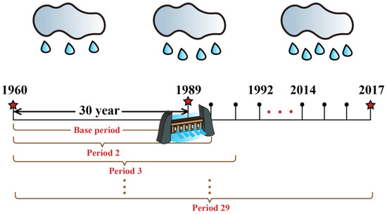 The design rainstorms of hydrological engineering under specific precipitation standards are generally calculated using long-series historical precipitation data. To detect changes in the design rainstorms of projects constructed in different years, this study adopted cumulative segmentation to establish the design rainstorm sequence. First, the annual maximum daily precipitation samples of 609 stations from 1960 to 2017 were taken. In terms of the time series, the previous 30 years (1960–1989) represents the base period, which guarantees that the hydrological samples are long series. After 1989, the maximum daily precipitation samples were cumulatively segmented into 28 subseries (1960–1990, 1960–1991, 1960–1992…1960–2017) in one-year increments. The specific segmentation method is shown in Figure 2. The cumulative segmentation is similar to the dynamic hydrological sequence method. However, the maximum daily precipitation samples of 29 subseries provide a data basis for design rainstorm calculations and cannot be averaged directly.