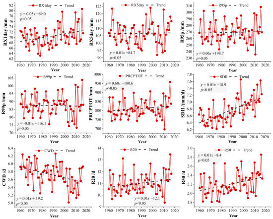 Temporal changes in average extreme rainstorm indices in China during 1960–2017.