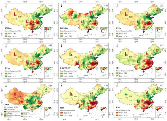 Changing trend distribution of nine extreme rainstorm indices during 1960–2017. (a) RX1day; (b) RX5day; (c) R95p; (d) R99p; (e) PRCPTOT; (f) SDII; (g) CWD; (h) R20; (i) R50.