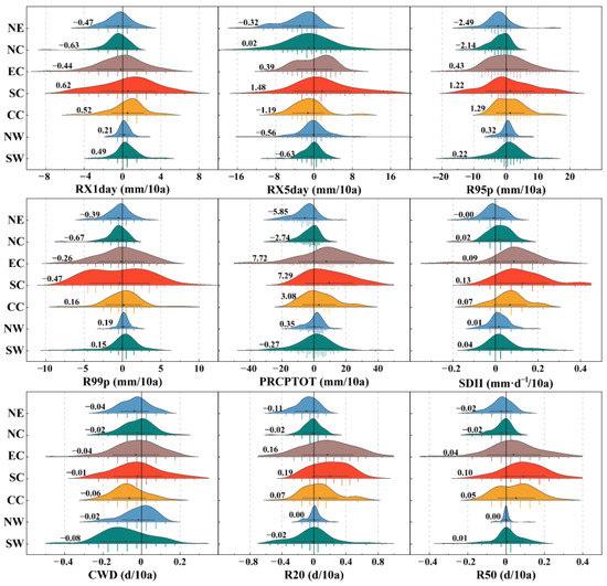 Overall, the amount indices showed significant increasing trends in SC, CC, NW, and SW (p < 0.05), and decreased significantly in NE and NC. The intensity index showed a significant increase outside of NE (p < 0.05). In the days index, CWD decreased significantly outside of SC, and the other indices were similar to the amount index.