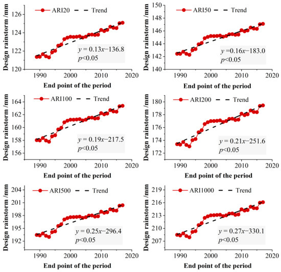 According to the temporal changes in the design rainstorms in 20-, 50-, 100-, 200-, 500-, and 1000-year return periods from 1960 to 2017 (Figure 8), the increasing rates of the design rainstorms were 1.3, 1.6, 1.9, 2.1, 2.5, and 2.7 mm/10a, respectively (p < 0.05). The rates of change increased with the return period.