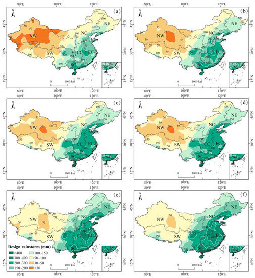 Spatial distribution of design rainstorms in China during 1960–2017. (a) ARI20; (b) ARI50; (c) ARI100; (d) ARI200; (e) ARI500; (f) ARI1000.
