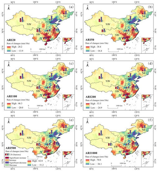 Changing trend distribution of design rainstorms in China during 1960–2017. (a) ARI20; (b) ARI50; (c) ARI100; (d) ARI200; (e) ARI500; (f) ARI1000.