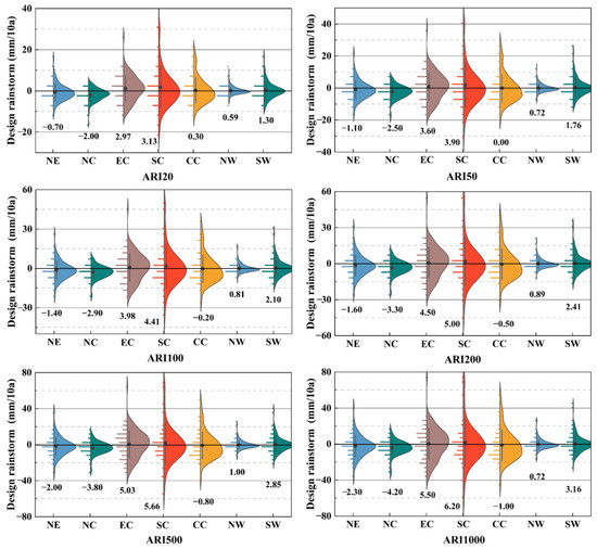 The spatial distribution of changes in the design rainstorm with different return periods were identical (Figure 10 and Figure 11), showing a significant increase in EC, SC, and SW and a significant decrease in NE and NC (p < 0.05).