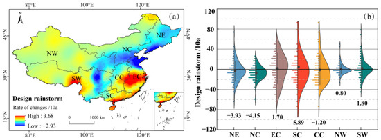 - The design rainstorm with different return periods showed a significant increase in China, increasing in EC, SC, NW, and SW and decreasing in NE, NC, and CC. In the 20-year return period, the design rainstorm had an increase at the rate of 1.3 mm/10a, which was mainly distributed in EC, SC, and SW, while NC showed a significant decrease (p < 0.05).