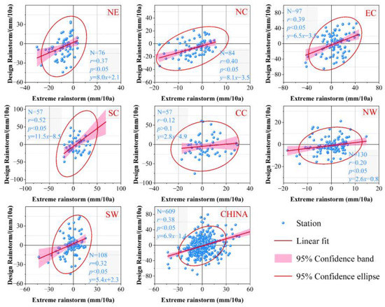 Both extreme rainstorm events and design rainstorms have time-varying characteristics after dimensionality reduction. The Pearson’s correlation coefficient (r-value) was used to explore the correlation between them [37]. If r > 0, the two variables are positively correlated, and the correlation increases with the r value. In addition, the confidence ellipse and confidence band show the confidence level of the correlation (confidence level is 95%).