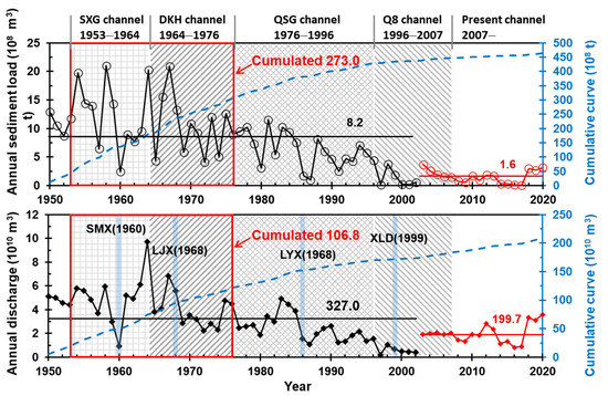 - Wang, H.; Yang, Z.; Saito, Y.; Liu, J.P.; Sun, X.; Wang, Y. Stepwise decreases of the Huanghe (Yellow River) sediment load (1950–2005): Impacts of climate change and human activities. Glob. Planet Chang. 2007, 57, 331–354. [Google Scholar] [CrossRef]
