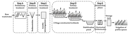 A representative example of an island that faces an influx of tourists during summer months is Antiparos Island in Greece. The MWTP of Antiparos Island is located at Sifneikos Gyalos (500 m from the Antiparos settlement) and occupies an area of 28,400 m2. The mean daily design capacity of the WWTP is 240 m3/d during winter (1500 p.e.) and 480 m3/d during summer (3000 p.e.). The MWTP involves five stages, Steps A–E, performed in line (Figure 2). Step A (preliminary treatment) removes coarse solids and other large materials by grits and course. Step B (primary treatment) removes organic as well as inorganic solids by sedimentation, in addition to removing floating materials by skimming [39]. Step C (secondary treatment) uses aerobic microorganisms to further treat an effluent to remove the residual organics and the remaining suspended solids. Step D (tertiary treatment) removes specific wastewater constituents, such as nitrogen, phosphorus, additional suspended solids, refractory organics, heavy metals, and dissolved solids, that could not be removed by secondary treatment [40]. Step E (disinfection phase) inactivates waterborne pathogens in treated wastewater that last ~40 min.