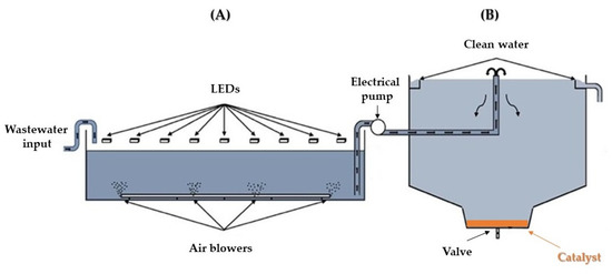 A custom-designed photocatalytic reactor system (Figure 3), which consisted of a properly designed rectangular concrete photocatalysis tank (100 × 50 × 10 cm) and a cylindrical concrete precipitation tank (d = 25 cm) with a conical bottom for optimal catalyst collection, were constructed, waterproofed, and used as a semi-pilot scale-up photocatalytic disinfection process of wastewater effluents. The photocatalytic tank had a volume capacity equal to 5 L. It was equipped with four air blowers to provide continuous aeration of the wastewater body (Figure 3A). Nine high-power Luxeon light-emitting diodes (LEDs) that emit light in the region of 440–460 nm (P = 4.5 mW cm−2) were placed 20 cm over the tank to irradiate the wastewater samples.