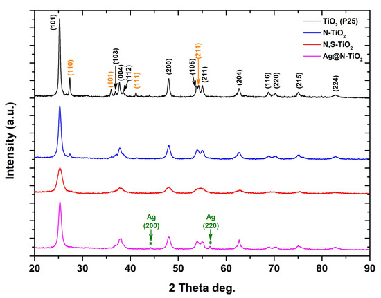 XRD pattern for the prepared chemically modified TiO2 powders. The crystal planes presented in black correspond to the TiO2 anatase phase, while the crystal planes presented in orange correspond to the TiO2 rutile phase. An asterisk is used to indicate the presence of Ag in the case of the Ag@N-TiO2 powder sample. The XRD pattern of commercial TiO2 (P25) is presented as a reference.
