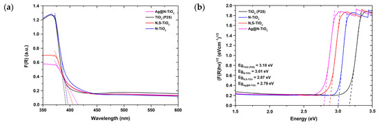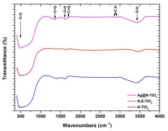 The broad absorption band observed in the 400–1000 cm−1 region is imputed to the Ti-O stretching of the oxygen bonds with two titanium atoms in nano-TiO2 [50]. The peaks at ≈1390 and 1710 cm−1, in the case of N,S-codoped TiO2 and Ag@N-doped TiO2 powder samples, can be assigned to the asymmetric stretching mode of titanium carboxylate [51]. Moreover, in all examined TiO2 samples, the peak at 1623 cm−1, along with the wide band between 3200 and 3600 cm−1, indicate the bending of oxygen-hydrogen bonds and stretching modes of hydroxyl groups, respectively, confirming the existence of moisture in the examined samples [52].