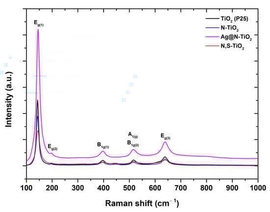 In the spectra of all the studied TiO2 powders, the prevalent Raman active modes can be attributed to anatase TiO2 phase. In particular, a peak characterized by strong intensity is spotted at approximately 145 cm−1 (Eg(1)), followed by peaks of lower intensity at 196 (Eg(2)), 398 (B1g(1)), 515 (coupling of A1g and B1g(2) that overlap at room temperature), and 639 cm−1 (Eg(3)) (see Figure 6). The position of Eg(1) Raman mode for the three studied chemically modified TiO2 powders varies from 143 to 146 cm−1, as seen in Figure 5. Various factors, such as phonon confinement, strain, crystallite size and crystallite size distribution, defects, non-stoichiometry, and anharmonic effects, can lead to the position’s shift of the Eg(1) Raman mode of anatase TiO2 [53]. Within the framework of this study, the main factors that influence the Eg(1) peak in the studied titanium dioxide powders, prepared via sol-gel method, could be attributed to crystallite size, as well as the presence of an adequate amount of rutile TiO2 phase combined with anatase, such as for N-TiO2 powder. These are confirmed by the plot presented in Figure S2, as the Eg(1) peak of the Ag@N-doped TiO2 powder appears at 146 cm−1, approximately, contrary to N,S-codoped TiO2 and N-doped TiO2 powders, where the peak’s position appears to be 144.46 and 143.21 cm−1, respectively, given the fact that Ag@N-doped TiO2 possesses the smallest crystallite size (1.80 nm), as well as no rutile phase. It could be also assumed that as the rutile phase vanishes (see Table 3 of XRD analysis), Eg(1) mode indicates a blue shift as it is extremely sensitive to anatase content, even in the case of low percentages of anatase (<50%) being present.