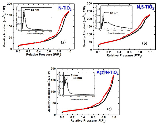 N2-sorption diagram of: (a) N-TiO2, (b) N,S-TiO2, and (c) Ag@N-TiO2 powder, as indicated (sorption: black line and desorption: red line). The insets show the pore size distribution by the BJH method for each chemically modified powder.
