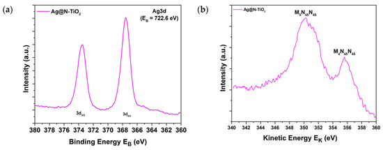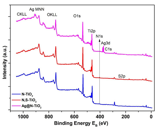 For investigating the surface, as well as the chemical state of the elements existing in the synthesized chemically modified TiO2 powder samples, XPS analysis was conducted. Figure 8 depicts the wide survey spectrum of N-doped TiO2, N,S-codoped TiO2, and Ag-loaded N-doped TiO2 samples. All the peaks were anticipated because the applied synthetic procedure was spotted. More specifically, the Ti2p doublet characterized by a spin orbit splitting equal to 5.75 eV, as well as the binding energy of Ti2p3/2, is located at 458.8 ± 0.1 eV and corresponds to Ti4+ in the TiO2 chemical state (Figure 9a). The O1s peak can be ascribed to lattice oxygen Ti-O in the TiO2 state, possessing binding energy equivalent to 530.0 ± 0.1 eV and hydroxides and/or adsorbed water on the surface characterized by a binding energy of 531.7 ± 0.1 eV (Figure 9b) [59]. Figure 10 shows the N1s peak centered at 400.1–400.5 eV, approximately, which can be assigned to N-Ti bonds [60]; and given that the observed line is located above 400 eV, an interstitially doped nitrogen mechanism could be proposed [61,62]. Figure 11a,b shows the Ag3d and AgMNN X-ray–induced Auger spectrum from the Ag@N-TiO2 sample. The modified Auger parameter (α) compromises the sum of the Ag 3d5/2 photoelectron peak’s binding energy, and the Ag M4N45N45 Auger peak’s kinetic energy is widely utilized to estimate the chemical state of silver atoms, which is found at 722.6 eV (α = 367.1 eV + 355.5 eV) attributed to Ag+ ions [63]. Lastly, Figure 12 shows the S2p peak of the N,S-TiO2 sample. The peak consists of two doublets (with spin orbit splitting 1.2 eV) where the binding energy of S2p3/2 components is centered at 167.7 eV assigned to sulphones (O=S=O) [64], and at 166.9 eV, is assigned to sulphites (SO32−) [65]. Generally, for S-doped TiO2 powders, a peak around 168 eV in the S2p spectra is usually ascribed to sulphur on the higher oxidation state (S4+, S6+), substituting Ti atoms in the TiO2 lattice [61].