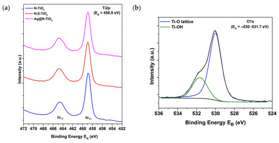 (a) Ti2p XPS peak of N-TiO2, N,S-TiO2, and Ag@N-TiO2. (b) Indicative O1s XPS peak of the studied chemically modified TiO2 powders.